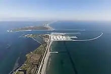Outside the inlet, a 1,000-metre (3,300 ft) long curved breakwater is almost complete.