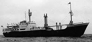 On 29 January, she began her return journey.[6] The ship had 40 crew, 55 passengers and a cargo of frozen fish on board[1] and in addition to that 3,25 tons of archives concerning Greenlandic history.[7][8][9] One of her passengers was the Danish parliament (Folketing) member Augo Lynge.[5] The next day, Hans Hedtoft collided with an iceberg about 35 nautical miles (65 km) south of Cape Farewell, the southernmost point of Greenland.[6] A distress call was given at 13:56 (local time) stating that the ship had hit an iceberg at 59°30′N 43°00′W.[5] The call was answered by the USCGC Campbell, the West German trawler Johannes Krüss[1] of Bremerhaven[5] and another West German trawler. Within an hour, another message was sent stating that the engine room was flooded.[1] At 15:12, it was announced that the ship was sinking. A final message was sent at 17:41 stating the ship was slowly sinking and requesting immediate assistance.[5] Aircraft in Newfoundland were grounded by the weather and unable to assist in the search for Hans Hedtoft.[1] The beginning of an SOS was received by Johannes Krüss at 17:41 after which communication with Hans Hedtoft was lost.[5] On 31 January, USCGC Campbell reported that conditions were the worst seen and there was no sign of Hans Hedtoft or her passengers and crew.[10] The search was called off on 7 February.[6] The only piece of wreckage ever recovered was a lifebuoy which washed ashore on Iceland and discovered on 7 October 1959, some nine months after the ship sank.[5] The ship sank with parish registers from parishes of Greenland, which were meant to be deposited in archives in Denmark, causing a major loss for Greenlandic genealogy.[11]