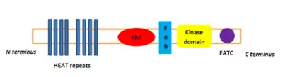 PIKKs have four domains at the protein level, which distinguish them from other protein kinases. From the N-terminus to the C-terminus, these domains are named FRAP-ATM-TRAAP (FAT), the kinase domain (KD), the PIKK-regulatory domain (PRD), and the FAT-C-terminal (FATC).[8] The FAT domain, consisting of four α-helices, is N-terminal to KD, but that part is referred to as the FKBP12-rapamycin-binding (FRB) domain, which binds the FKBP12-rapamycin complex.[8] The FAT domain consists of repeats, referred to as HEAT (Huntingtin, Elongation factor 3, A subunit of protein phosphatase 2A and TOR1).[9] Specific protein activators regulate the PIKK kinases but binding of them to the kinase complex causes a conformational change that increases substrate access to the kinase domain.[9]