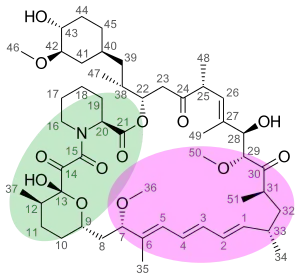The pipecolate region of rapamycin structure seems necessary for rapamycin-binding to FKBP12. This step is required for further binding of rapamycin to the mTOR kinase, which is the key enzyme in many biological actions of rapamycin.[45]