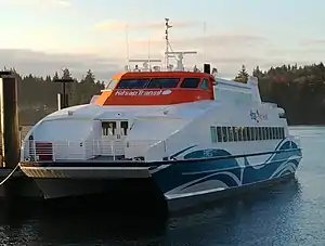 MV Finest is an aluminum-hulled[6] catamaran fast passenger ferry built at Derecktor Shipyards in 1996. She is owned and operated by Kitsap Transit on a Seattle–Kingston route since 2018. Finest is a former NY Waterway vessel and at one point provided service from the Massachusetts mainland to Martha's Vineyard and Nantucket.[7]
