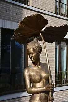 Chodakowska states that inspiration for her sculpture comes from travel. A visit to Portugal inspired her oak-wood sculpture "Portugiesischer Schönling" (loosely, "little Portuguese beauty"). She says that another trip, this time to Egypt in 1996, enabled her to lose her reticence over working with gold.[12] Visiting Cambodia in 2000, she was inspired by Khmer carved stone temple dancers that "revealed the embodiment of good and evil bound together in ecstatic unison".[13] Małgorzata Chodakowska's work is both attractive and skilfully promoted.[14] She explained to an interviewer that in 2005 she reached the point that she no longer had to sell everything that she could produce to put food on the table.[9][12] Since then she has generally retained her original hardwood sculptures, often displaying them on the family vineyard, while selling only the bronze castings produced from them.[10] One speciality is her so-called "water sculptures" or "fountain figures" which combine an attractive (normally) female figure with a fountain.[15] One (admittedly extreme) example of Chodakowska's commercial success was reported in 2010 when "Überfluss" ("Abundance"), a 1.80-meter high bronze fountain figure completed in 2009, was sold to a businessman for €50,000.[16][17]