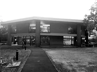 This library displays Frederick Romberg’s interest in complex geometries and continues the polygonal type pavilion design similar to the planning arrangement he explored with Picken Court (1961–1963). The classical rotunda form and central spiral staircase were influence by Karl Schinkel.