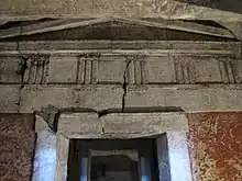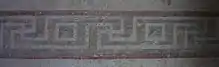 The smaller Tomb B is located south of the service area Korinos (west of the motorway) and is accessible from a parallel road. The mound has a diameter of 40 meters and is 13 meters high.[7] The tomb consists of a vaulted passage, a 1.5 x 3 meter measuring antechamber and the 3 by 3 meter grave chamber. The antechamber was secured by a wall and by a two-winged door. The door, which was found broken but has since been restored and reattached, is made of limestone which was once plastered and is very heavy. The floor of the antechamber and the tomb are laid out with stone slabs, the walls are decorated with a circulating meander.