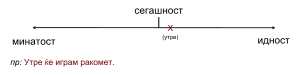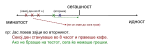 The Present tense (сегашно време, segašno vreme) is used to express present actions and actions that overlap with the moment of speaking and this meaning is expressed with the use of imperfective verbs. Besides that, the Present tense can be formed with the perfective verbs as well, but then it is not true present action, but more likely future in the past. Besides the present action, with the forms of present tense there is possibility to express: