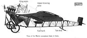 | Side view showing the general layout of the Macfie Monoplane. Note the king-posts and bracing wires for wing-warping and the fuel tank. Image from Flightglobal (see Bibliography below) | |