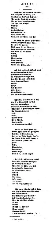 The poem appeared also in Johann Peter Lange's hymnal in 1843, in the Jauersches Gesangbuch in Breslau in 1855, in an Oldenburg hymnal and the Schlesisches Gesangbuch both in 1868, among others.[3] In 1938, it became part of the hymnal Kirchenlied with a melody by Adolf Lohmann.[4] It was one of the Christköniglieder, proclaiming Christ the King in opposition to the Nazi regime.[5]