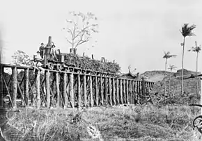The estate had a 3 ft 6 in (1,067 mm) gauge line of rails some three and a-half miles in length. The line was substantially laid on sleepers, and was similar in construction to ordinary lines. The trestle over Fursden Creek was made of 200 yd (180 m) piles, which were of up to 20 ft (6.1 m) high. In 1881 Spiller has also procured from England two miles of permanent steel rails and one mile of portable rail, which will be added to the present line of 3½ miles, now running from one end of the estate to the other.[4]