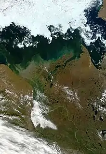 The river discharges more than 325 cubic kilometres (78 cu mi) of water each year, accounting for roughly 11% of the total river flow into the Arctic Ocean.[24][25] The river is frozen for most of the year, with the ice typically breaking up by early to mid-May in the south, and late May-early June in the north.[26] Ice breaks up earlier on the tributaries, sometimes causing ice jams and flooding where they meet the Mackenzie. In the middle of the larger lakes, such as Great Slave, ice can persist as late as mid-June. The river typically freezes by late October or November, starting in the north. Year round, the Mackenzie's outflow has a major stabilizing effect in the local climate above the Arctic Ocean with large amounts of warmer fresh water mixing with the cold seawater.[2]