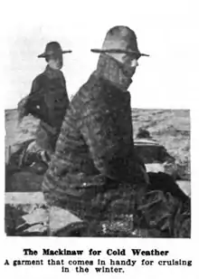 In the days of the Old West, heavyweight "buffalo plaid" tartan Mackinaw jackets were worn with knit caps by American and Canadian lumberjacks in the Midwest, Northwest territories and Alaska.[4] By the 1930s, the jacket had also found widespread use as sportswear among hunters[5] and fishermen, together with a knit cap. A variant of the Mackinaw in olive drab[6] was issued to the US Army for cold weather use by Jeep crews.[7] After the war, plaid jackets of this type, manufactured under the Pendleton brand, became popular casual wear for American men as an alternative to the similar Hollywood jacket.[8]