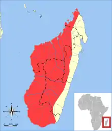 Examination of the droppings from the Madagascan fruit bat show that it mainly consumes fruit but also feeds on the flowers of Eucalyptus spp.. It was found to fly as far as 5 kilometres (3.1 mi) to reach trees of Polyscias spp. while largely neglecting the guava trees Psidium near its roost. Seeds smaller than about 7 mm (0.3 in) in diameter were swallowed. This helped with dispersal of the seed and it has been shown that seed germination was enhanced by their passage through the gut.[3] At times of year when fruit is not available, this bat feeds on nectar. It has been observed to visit the flowers of the rare baobab Adansonia suarezensis and the kapok tree Ceiba pentandra and it is believed to pollinate these trees.[4]
