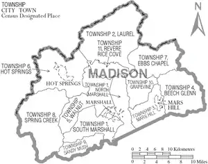 The county is divided into eleven townships: Beech Glenn, Ebbs Chapel, Grapevine, Hot Springs, Laurel, Mars Hill, Marshall, Revere Rice Cove, Sandy Mush, Spring Creek and Walnut.[12]