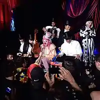 Madonna was aided by her son David Banda, who was adopted by the singer from Malawi; Banda introduced Madonna and told the audience who bought the tickets about how "lucky" he was. The Tears of a Clown show was over an hour long, with Madonna giving her opinions on the 2016 United States Presidential Election, panning President elect Donald Trump.[19] One of the new songs included in the set list was Britney Spears' "Toxic" (2004), which Madonna sang slowly, as images of Trump were displayed in video backdrops. The singer also spoke about the turmoils of the Native Americans and the Dakota Access Pipeline protests, and then sang "American Life" (2003).[19] Other songs performed included "Express Yourself" (1989), "Beautiful Stranger" (1999) and "Don't Tell Me" (2000). During "Holiday", one fan got the chance to hold Madonna's microphone as she played the ukulele and sang, as well as another fan donating $10,000 in exchange for kissing the singer.[20] In total, Madonna raised about US$7.3 million from her own items. The Associated Press reported that "[the] night was punctuated by [Madonna's] sardonic humor, corny clown jokes, controversial political statements and heartfelt moments about how much the hospital project means to her."[19]