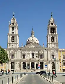 Located 40 km northwest of Lisbon,[11] The Mafra Royal Building and adjacent property, was conceived by King John V (D. João V) in 1711 as a tangible representation of his idea of monarchy and State. This imposing quadrangular building houses the king and queen's palaces, a royal chapel shaped like a Roman baroque basilica, a Franciscan monastery and an impressive library containing 36,000 volumes.[12] The complex is completed by the Cerco garden,[13] with its geometric layout and the royal hunting park and grounds (Portuguese: Tapada de Mafra[14]).