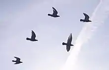 Homing pigeons can use magnetic fields as part of their complex navigation system.[44] William Keeton showed that time-shifted homing pigeons (acclimatised in the laboratory to a different time-zone) are unable to orient themselves correctly on a clear, sunny day; this is attributed to time-shifted pigeons being unable to compensate accurately for the movement of the sun during the day. Conversely, time-shifted pigeons released on overcast days navigate correctly. This led to the hypothesis that under particular conditions, homing pigeons rely on magnetic fields to orient themselves. Further experiments with magnets attached to the backs of homing pigeons demonstrated that disruption of the bird's ability to sense the Earth's magnetic field leads to a loss of proper orientation behavior under overcast conditions.[45] There have been two mechanisms implicated in homing pigeon magnetoreception: the visually mediated free-radical pair mechanism and a magnetite based directional compass or inclination compass.[46] More recent behavioral tests have shown that pigeons are able to detect magnetic anomalies of 186 microtesla (1.86 Gauss).[47]