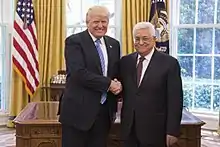 | 1) Abbas's term as President expired 15 January 2009, since when Aziz Duwaik had been recognised as President by the Haniyeh government in the Gaza Strip, while Abbas is recognised as President by the Fayyad government in the West Bank and all the states that recognise the independence of Palestine, as well as the UN.[4] In April 2014 he was recognized by Haniyeh in the context of the Unity Government.[5] | |