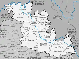Main-Tauber-Kreis is a Landkreis (district) in the northeast of Baden-Württemberg, Germany. Neighboring districts are (from northwest clockwise) Miltenberg, Main-Spessart, Würzburg, Neustadt (Aisch)-Bad Windsheim and Ansbach (all in Bavaria), and the districts of Schwäbisch Hall, Hohenlohe and Neckar-Odenwald.