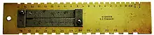 About 1840 Aaron Lufkin Dennison devised a gauge "upon which all the different parts of a watch could be accurately measured", Figure 3. Later this became known as the "US Standard" gauge. The edges have the usual notches for mainspring heights (based on the Imperial inch, but there is no obvious way to determine mainspring strength, except perhaps by barrel diameter using one of the three scales on the top left (which are Imperial inch scales in 1/64 and 1/32 divisions).