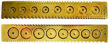 They were made by several European companies and are all similar to the gauge in Figure 1, being brass plates with notches on both edges and round sinks on both sides. The height of a spring is measured by finding the smallest notch on the edge of the gauge into which it will fit. The strength is determined by finding the smallest round sink into which the mainspring barrel (horology) will fit. (The diameter of the barrel is related to the mainspring length and strength, but this method for determining strength only works for springs of standard lengths.)