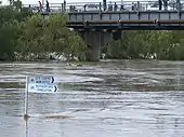 In early June 2007 an intense low pressure system which caused devastating storms to hit the city of Newcastle and the Central Coast also caused major flooding throughout the lower Hunter Region including the Maitland area. During the flooding in 2007, the Hunter River was expected to reach a peak of 11.3 m (37.1 ft) at Maitland's Belmore Bridge and break levee banks. Some 4000 residents of the suburb of Lorn were evacuated before the floodwaters became stable at 10.7 m (35.1 ft) and did not inundate central Maitland.[16] Other areas did not escape with waters inundating homes in Branxton, Louth Park and Raymond Terrace. The flood has been compared to the devastating 1955 Hunter Valley floods.
