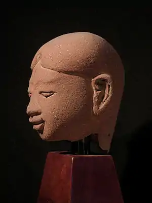Many small heads are found in the surrounding environs with no bodies. These range in size from 3 cm up to 10 cm. Many of these heads show Javanese features with hair style and ear ornamentation. Some think that the reason there are so many more heads and headless bodies found than complete figurines is that they were decapitated in ritual offerings.[5] If one is to look at contemporary Bali as a shadow of Majapahit, even today a small ceremony is sometimes performed in which a pair of small figures are placed on the rice field wall. These are made out of clay, unfired and are left to be reabsorbed by the elements, For the most part these heads are solid, but occasionally thin walled examples are found. It is postulated that the more heavily ornamented faces represent ladies belonging to the upper classes.[6]