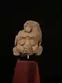 Many human figurines have been found decapitated, suggesting their use as effigies or religious offerings. However, construction techniques may also have rendered them fragile. Another explanation is that these figurines were secular play objects, cast aside once broken.[7] Commonly the figurines are small, measuring and constructed by the coil and pinch methods with carved or incised decorations, a forming method that is sculptural.[8] Other figurines are made by moulding, as is the figure in the first image two images below. This is an unusual example in that there is no fracture line at the neck. The variety of expression is infinite with naturalistic postures and facial expressions. Complete figurines are rare compared to the many headless figures or heads without bodies. They often take the form of a woman sitting in a polite female pose, on her calves with her feet tucked underneath.[9] The figure on the Right is complete. The second figurine the head has been separated but the two fragments were found together. She sits holding something to her chest. This is either a talam or offering tray, or as Kunst (1927) thought, it may be a drum.[10] The third figurine is sitting and playing what can clearly be seen as a musical instrument. Next to her is a figurine with a red slip around her neck, presumably where at the place where the head would be separated. The reason for there being so many heads without bodies is unknown but it is speculated that the figurines were possibly decapitated in a ritual offering.[9]