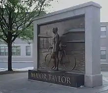 In 1998, in Taylor's adopted hometown of Worcester, where he lived for 35 years, the Major Taylor Association was formed by locals with the goal of erecting a permanent memorial to Taylor outside the Worcester Public Library and telling his story.[151][152][153][154] On July 24, 2006, the city renamed the Worcester Center Boulevard, a high-traffic downtown street, to Major Taylor Boulevard.[155][156] At the same time, funding for the memorial was secured with the Massachusetts Legislature approving $205,000, signed by governor Mitt Romney.[155] The opening ceremony took place on May 21, 2008, attended by Tour de France winner Greg LeMond.[152] The memorial features a bronze sculpture of Taylor surrounded by granite was created by Antonio Tobias Mendez, who was chosen from over more than 60 others.[157] At the grand opening of Worcester's Applebee's restaurant in 2000, Taylor was selected as their "hometown hero", and has a display of his memorabilia.[158] In 2002, the Educational Association of Worcester and the Worcester Public Schools, together with the Major Taylor Association, developed a curriculum guide on Taylor,[159] which has since been expanded and used in schools nationwide.[158] Since 2003, Worcester has hosted the annual "George Street Bike Challenge for Major Taylor" amateur hillclimb event.[160]