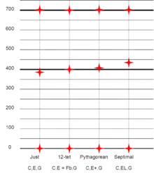 This may be found on I, IV, V, ♭VI, ♭III, and VI.[2] In equal temperament, the fifth is only two cents narrower than the just perfect fifth, but the major third is noticeably different at about 14 cents wider.