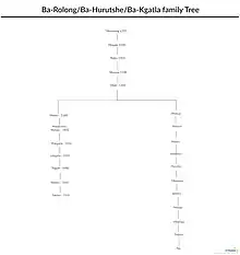 The traditions of the Barolong kingdoms indicate that at some time in the past up until the leadership battles of the 14th Century they were all under the same rule of a line of kings who claimed descent from a common ancestor, Morolong.[4] Following the death of Morolong's 4th generation great- grandson Masilo there was a leadership crisis that resulted in the formation of the Ba-Hurutshe and Ba-Kwena clans. the kholokoe tribe claim lineage from the Ba-Hurutshe clan and traced their early ancestry to Mokgatla, the founder of the BaKgatla and his 4th generation great grandson Tabane.
