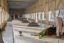 The entrance to the courtyard is one of the mosque's most striking features with a rectangular, arched, and canopied building that houses the marble graves of the Asaf Jahi dynasty rulers. This structure was created during the rule of the Asaf Jah rulers. It contains the tombs of all Asaf Jahi rulers except the 1st and the last Nizam, Mir Osman Ali Khan, who is buried in Judi Mosque opposite King Kothi Palace[6][7]