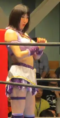 Makoto's 2009 was highlighted by a feud with her former partner Etsuko Mita, which built to Mita's retirement match on November 1, 2009, where she defeated Makoto.[28][29][30] The feud with Mita also led to the evolution of Makoto's character, turning her from a weak and scared comedic character to a more serious competitor.[1][2] In 2010, Makoto began making appearances for other promotions such as Kaientai Dojo, Osaka Pro Wrestling, Pro Wrestling Zero1 and Smash.[28] On December 26 at Ribbon Mania 2010, Makoto faced Tajiri in a losing effort.[31] In January 2011, Makoto became the leader of a stable named "Heisei YTR" (Young Traditional Revolution), which also included Chii Tomiya, Hikari Minami, Kurumi, Riho and Tsukushi.[32] The group mainly feuded with the "Ichinisanshidan" stable, which included Hikaru Shida, Miyako Matsumoto, Mochi Miyagi, Tsukasa Fujimoto and Mika Iida, who was originally a member of Heisei YTR, but switched sides early on in the rivalry.[32][33] On February 6, Makoto and Riho made it to the finals of the Ike! Ike! Ima, Ike! Ribbon Tag Tournament, before being defeated by Hikaru Shida and Tsukasa Fujimoto in a match that was also contested for the International Ribbon Tag Team Championship.[34] On March 21, Makoto had another high-profile match against a male wrestler, when she was defeated by Taka Michinoku at Ice Ribbon March 2011.[35] During the first half of 2011, Makoto also made several appearances for Union Pro Wrestling, where she portrayed a tougher villainous character, working under the ring name Makoto-hime ("Princess Makoto") and managing Cao Zhang and Choun Shiryu during their Big China Unified Nakahara Tag Team Championship reign.[12][36][37]