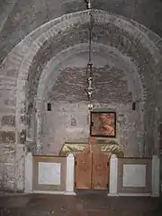 The kingdom of Makuria was, at least temporarily, exercising influence over the Nubian-speaking populations of Kordofan, the region between the Nile Valley and Darfur, as is suggested by an account of the 10th century traveller Ibn Hawqal as well as oral traditions.[88] With the southern Nubian kingdom of Alodia, with which Makuria shared its border somewhere between Abu Hamad and the Nile-Atbara confluence,[89] Makuria seemed to have maintained a dynastic union, as according to the accounts of Arab geographers from the 10th century[90] and Nubian sources from the 12th century.[91] Archaeological evidence shows an increased Makurian influence on Alodian art and architecture from the 8th century.[92] Meanwhile, evidence for contact with Christian Ethiopia is surprisingly scarce.[93][94] An exceptional case[95] was the mediation of Georgios III between Patriarch Philotheos and some Ethiopian monarch,[96] perhaps the late Aksumite emperor Anbessa Wudem or his successor Dil Ne’ad.[97] Ethiopian monks travelled through Nubia to reach Jerusalem,[98] a graffito from the church of Sonqi Tino testifies its visit by an Ethiopian abuna.[99] Such travellers also transmitted knowledge of Nubian architecture, which influenced several medieval Ethiopian churches.[60]
