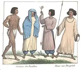 The Nubians upstream of Al Dabbah started to assume an Arabic identity and the Arabic language, eventually becoming the Ja'alin, claimed descendants of Abbas, uncle of Muhammad.[169] The Ja'alin were already mentioned by David Reubeni, who travelled through Nubia in the early 16th century.[170] They are now divided into several sub-tribes, which are, from Al Dabbah to the conjunction of the Blue and White Nile: Shaiqiya, Rubatab, Manasir, Mirafab and the "Ja'alin proper".[171] Among them, Nubian remained a spoken language until the 19th century.[170] North of the Al Dabbah developed three Nubian sub-groups: The Kenzi, who, before the completion of the Aswan Dam, lived between Aswan and Maharraqa, the Mahasi, who settled between Maharraqa and Kerma and the Danagla, the southernmost of the remaining Nile Valley Nubians. Some count the Danagla to the Ja'alin, since the Danagla also claim to belong to that Arab tribe, but they in fact still speak a Nubian language, Dongolawi.[172] North Kordofan, which was still a part of Makuria as late as the 1330s,[173] also underwent a linguistic Arabization similar to the Nile Valley upstream of Al Dabbah. Historical and linguistic evidence confirms that the locals were predominantly Nubian-speaking until the 19th century, with a language closely related to the Nile-Nubian dialects.[174]