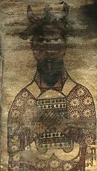 As of 2019, around 650 murals distributed over 25 sites have been recorded,[190] with more paintings still awaiting publication.[191] One of the most important discoveries of the rushed work prior to the flooding of Lower Nubia was the Cathedral of Faras. This large building had been completely filled with sand preserving a series of magnificent paintings. Similar, but less well preserved, paintings have been found at several other sites in Makuria, including palaces and private homes, giving an overall impression of Makurian art. The style and content was heavily influenced by Byzantine art, and also showed influence from Egyptian Coptic art and from Palestine.[192] Mainly religious in nature, it depicts many of the standard Christian scenes. Also illustrated are a number of Makurian kings and bishops, with noticeably darker skin than the Biblical figures.
