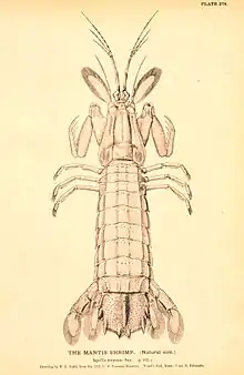 Stomatopoda is the only extant order of Hoplocarida, the other two orders, Aeschronectida and Archaeostomatopoda being extinct. Stomatopodans, commonly known as mantis shrimps, range in length from 5 to 36 cm (2 to 14 in) and are predators. They have a dorso-ventrally flattened body and a shield-like carapace and are armed with powerful, raptorial claws normally carried in a folded position. There are about 300 species, most living in tropical and subtropical seas although some live in temperate areas. They are benthic, mostly hiding in cracks and crevices or living in burrows, some emerging to forage while others are ambush predators.[7][9]