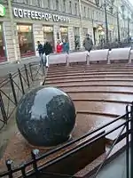 In 1999 Malaya Sadovaya Street was turned into a pedestrian zone.[3] The street was paved with tiles, the separation between street and sidewalk was removed, benches were added, pipes were laid under the streets carrying heated water to keep the street free of snow and ice,[3] and a fountain featuring a Kugel ball (a heavy stone ball easily rotatable because of lubrication by the fountain's water) was built.