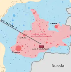 Malaysia Airlines Flight 17 (MH17)[lower-alpha 1] was a scheduled passenger flight from Amsterdam to Kuala Lumpur that was shot down on 17 July 2014 while flying over eastern Ukraine. All 283 passengers and 15 crew were killed.[3] Contact with the aircraft, a Boeing 777-200ER, was lost when it was about 50 km (31 mi) from the Ukraine–Russia border, and wreckage of the aircraft fell near Hrabove in Donetsk Oblast, Ukraine, 40 km (25 mi) from the border.[4] It was Malaysia Airlines' second aircraft loss during 2014, after the disappearance of Flight 370 on 8 March.[5] The shoot-down occurred in the War in Donbass, during the Battle in Shakhtarsk Raion, in an area controlled by pro-Russian rebels.[6] The Ukrainian Air Force had suffered losses from increasingly sophisticated air defence weaponry. Immediately after contact with the aircraft was lost, the rebel militia in Donetsk claimed to have shot down a Ukrainian An-26 military transport airplane.[7] When it became apparent that the wreckage that fell near Hrabove was from a civilian airliner, the separatists withdrew this claim and denied shooting down any aircraft.[8][9][10]