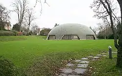 The school campus has a listed sports hall – The Edinburgh Dome, so named as it was unveiled by the Duke of Edinburgh. It consists of a round, green, balloon-shaped building, containing squash courts, a gym area and a games area, surrounded by a moat. Based on an innovative roof construction by Dante Bini, the Binishell (or Parashell), it was built in 1977 by architect Michael Godwin and consultant engineer John Faber. It was opened in 1978. On the advice of English Heritage it has been designated a Grade II listed building.[15]