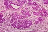 Tumorigenesis in mammary glands can be induced biochemically by abnormal expression level of circulating hormones or local ECM components,[50] or from a mechanical change in the tension of mammary stroma.[51] Under either of the two circumstances, mammary epithelial cells would grow out of control and eventually result in cancer. Almost all instances of breast cancer originate in the lobules or ducts of the mammary glands.