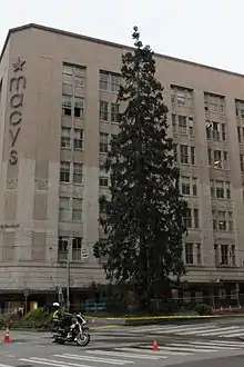 Miller climbed an 80-foot (24 m) sequoia in a Stewart Street traffic island outside the historic former Bon Marché flagship store in downtown Seattle, early on March 22, 2016. He remained there for nearly 25 hours while police forces attempted to coax him down.[1] Miller responded to dialog attempts by throwing sequoia cones, branches he had torn from the crown, and fruit remains,[2] some of which hit passersby.[1] The falling debris and the intervention efforts gridlocked roadways in downtown Seattle’s center, forcing multiple buses to find alternate routes.[2] The event garnered significant media attention, prompting viral Twitter parodies, live streams of negotiation efforts,[3][4] and national news coverage.[5] After over 24 hours, Miller descended the tree of his own accord at around 11:45 AM on March 23, where he was given food and taken into an ambulance.[2] Miller was subsequently charged with third-degree assault and first-degree malicious mischief[1] but was found incompetent to stand trial after a psychiatric competency evaluation.[6][7]
