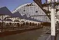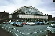 A temporary wooden building, erected at the front of the station to house ticket offices and waiting rooms was planned to be replaced by a grander edifice, for example a hotel and railway offices as at London St Pancras, but remained in use until the station closed. The Midland Hotel was built by the Midland Railway in 1898–1903 on an adjacent site.