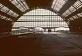 The station's roof is a single span wrought iron truss structure 550 feet (168 m) long with a span of 210 feet (64 m), and was 90 feet (27 m) high at its apex above the railtracks. Glass covered the middle section, timber (inside) and slate (outside) covered the outer quarters. The end screens were glazed with timber boarding surrounding the outer edges. It was constructed by Andrew Handyside and Co.[4] The substructure and masonry partition were provided by Robert Neill and Sons of Manchester. Underneath the train shed is a large brick undercroft with intersecting tunnel vaults, above which were six platforms above street level which exited the station onto viaducts and bridges.[5] The undercroft was used for storage and connected to the adjacent goods sidings by a carriage lift. The station's two-storey south wall has 15 bays separated by brick pilasters. At ground-floor level the bays have three round-headed windows and at first-floor level three square-headed. In the 20th century a glazed canopy was erected at the entrance at north end.[2]