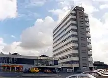 Many of the original station buildings were demolished during the 1960s to clear the way for a new approach.[12] The main entrance leads to a concourse with ground floor, and since the 2000s, mezzanine levels. The Fairfield Street entrance leads to the Metrolink station in the undercroft and is linked to the rail platforms by escalators. Between 1997 and 2002, a redevelopment programme revised the station's layout and a glass partition wall with ticket barriers separating the concourse from the platforms was constructed.[36] The station's approach leading to the end of Piccadilly was constructed in 1969 along with the "wavy" fronted Gateway House designed by the architect Richard Seifert. Gateway House was modernised during 2003.[12]