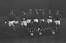 Newton Heath's uniform in 1879, four years before the club played its first competitive match, has been documented as 'white with blue cord'.[81] A photograph of the Newton Heath team, taken in 1892, is believed to show the players wearing red-and-white quartered jerseys and navy blue knickerbockers.[82] Between 1894 and 1896, the players wore green and gold jerseys[82] which were replaced in 1896 by white shirts, which were worn with navy blue shorts.[82]