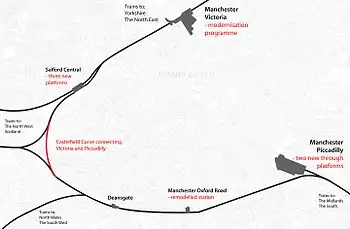 The Ordsall Chord (also known as the Castlefield Curve) was opened in 2017, which now links all four of Manchester's main stations. Other proposals are yet to start construction. Two new through platforms will be built at Piccadilly and Victoria will be upgraded. The implementation of the Northern Hub proposals would reduce journey times to and from Liverpool by 15 minutes, Leeds by 15 minutes and Sheffield by 5.[8]