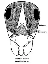 The mandibles of adult and larval Odonata appear simple and generalized, although there are typically six or seven mandibular muscles.[1] Ephemeroptera rarely feed as adults, though the nymphs have simple mandibles.[2]