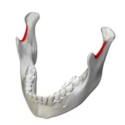 ![]() Position of mandibular notch in mandible, shown in red. | |