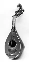 The mandore is a musical instrument, a small member of the lute family, teardrop shaped, with four to six courses of gut strings[2] and pitched in the treble range.[3] Considered a French instrument, with much of the surviving music coming from France, it was used across "Northern Europe" including Germany and Scotland. Although it went out of style, the French instrument has been revived for use in classical music. The instrument's most commonly played relatives today are members of the mandolin family and the bandurria.