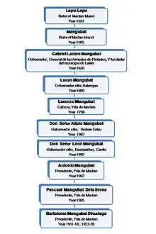 - Bartolome Mangubat (Dimataga) (1911–1918 ; 1923–1928) Mactan Island Municipal President. His direct descendants include, Mayor Mariano Dimataga (Lapu-lapu City) ; Cabinet Secretary Jose Rene Almendras, former Philippines first lady Leonila Dimataga Garcia ; former Vice Mayor (Danao, Cebu) Rosita Dimataga Almendras.