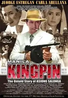 Manila Kingpin: The Untold Story of Asiong Salonga is a 2011 multi-awarded Filipino biographical-crime film, winning 11 awards at the 2011 Metro Manila Film Festival.[2] Produced by Scenema Concept International released by VIVA Films and under the direction of Tikoy Aguiluz, the film stars Jeorge "E.R." Estregan in the title role, with Carla Abellana and Phillip Salvador.